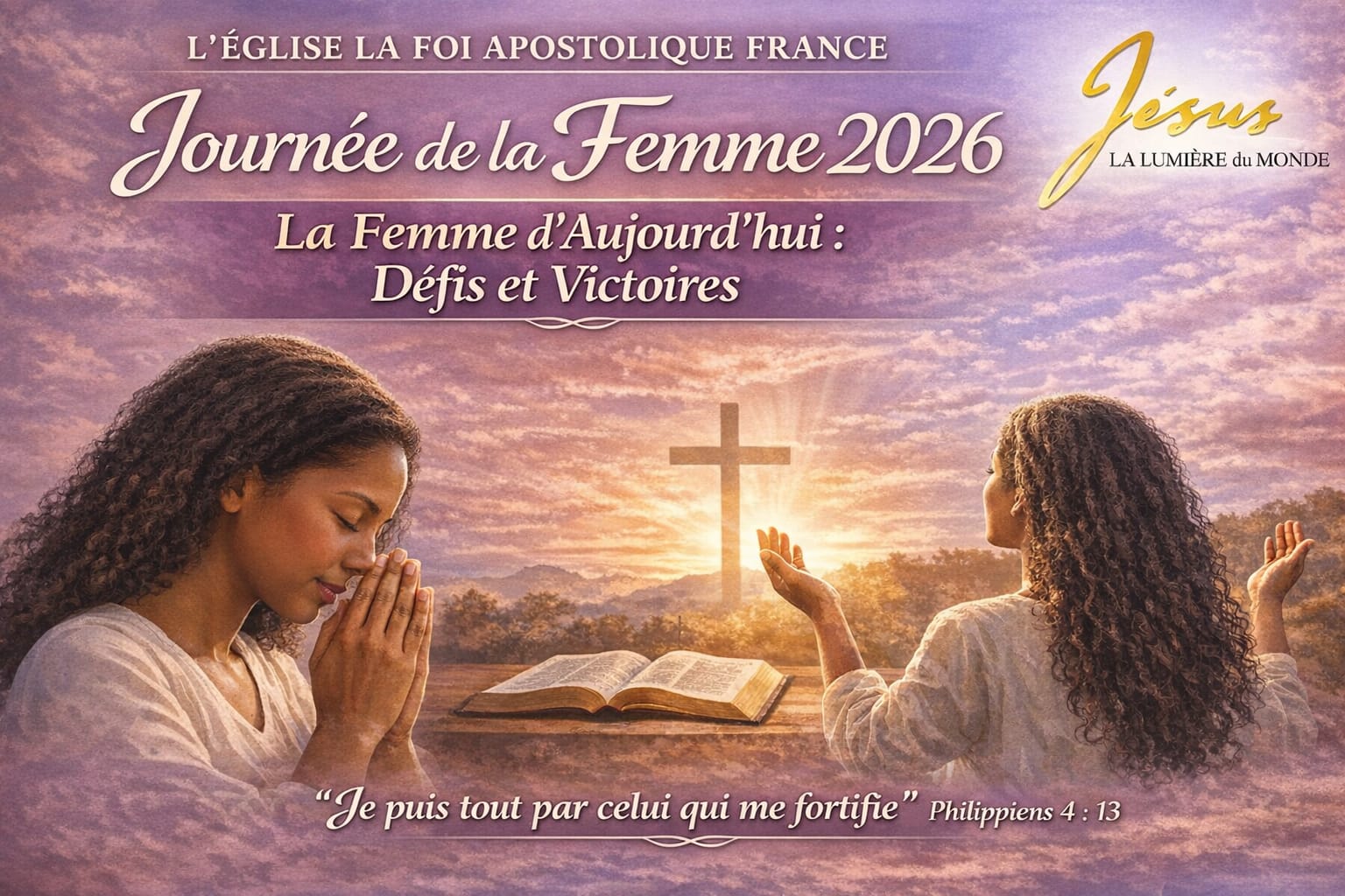 L’ÉGLISE LA FOI APOSTOLIQUE FRANCE vous invite à son Culte des femmes qui aura lieu le dimanche 08 mars 2026 à 9h50.
